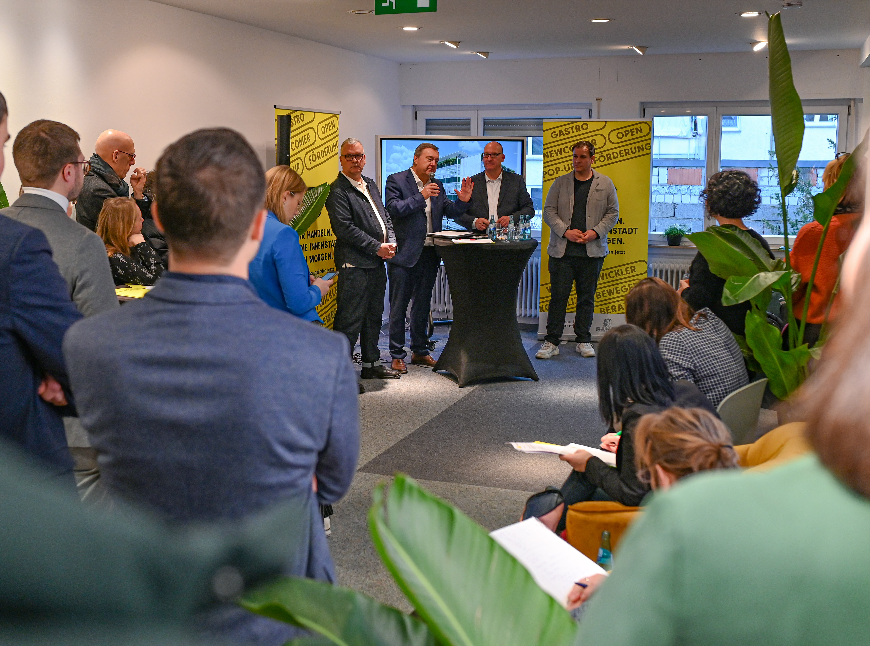 In einer vielbeachteten Pressekonferenz auf dem Sportsfield-Gelände präsentierte OB Kaminsky mehrere Thesen, die als Anregung für eine Änderung des Baurechts dienen sollen. Unterstützt wurde er dabei von Martin Bieberle, Fachbereichsleiter Planen, Bauen & Umwelt, Dr. Michael Denkel und Dipl.-Ing. Lutz Krämer-Heid von Albert Speer und Partner (AS+P) und Dr. Olaf Otting, Fachanwalt für Verwaltungsrecht bei Allen & Overy LLP.