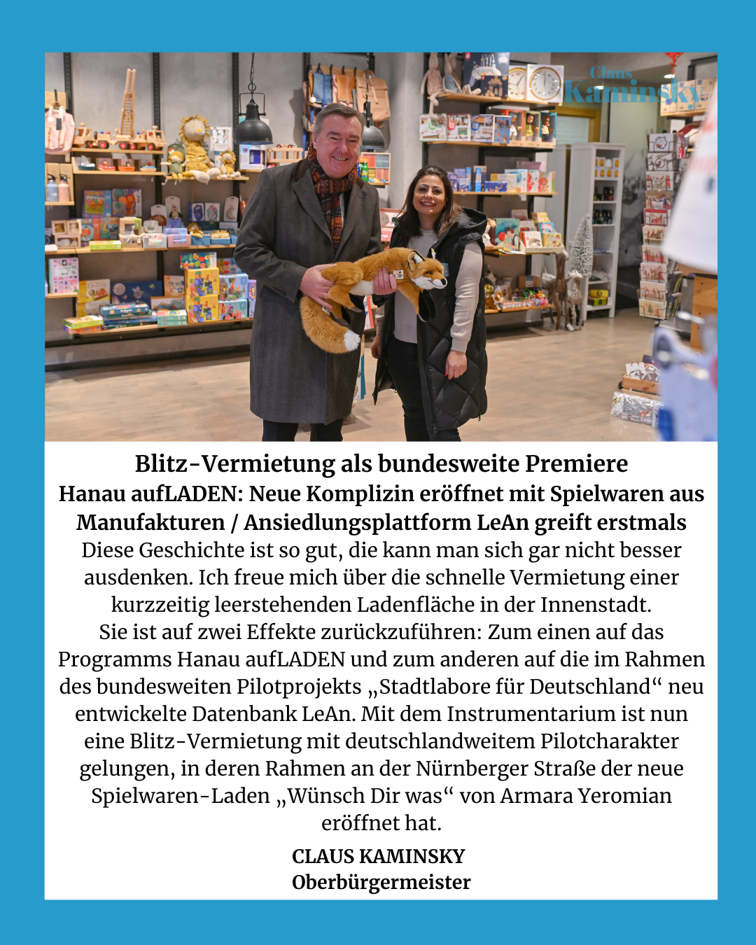 Der Beschluss der Vorkaufsrechtssatzung ist ein Teil eines ganzen Maßnahmenbündels, welches die Hanau Marketing GmbH zur Zeit mit Vertretern des Einzelhandels, des Hanau Marketing Vereins, der IHK, Haus und Grund und weiteren Akteuren erarbeitet und diskutiert. Dieses Bündel beschäftigt sich auch mit der Frage, wie zukünftig gute Einzelhandelskonzepte im Bestand erhalten und neue Konzepte angesiedelt werden können. Das Gesamtpaket soll Anfang des nächsten Jahres im Struktur- und Umweltausschuss ausführlich vorgestellt werden.