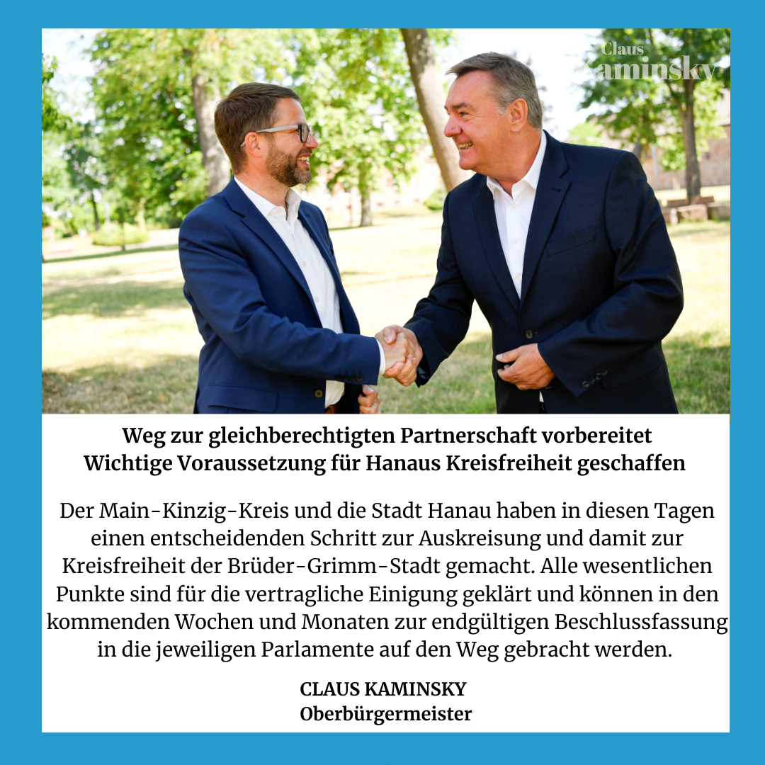 Der Entwurf eines Auseinandersetzungsvertrages wurde erstellt und dem Kreis im Oktober 2019 übersandt. Im November hat schließlich auch der Kreistag des Main-Kinzig-Kreises beschlossen, Verhandlungen mit Hanau zur Auskreisung zu führen. Nach einem ersten Treffen der Verhandlungskommission werde jetzt auf Arbeitsebene nach Lösungen für offene Fragen in Sachen Personal, Finanzen, Gesundheit, aber auch mit Blick auf das künftige Zusammenarbeiten gesucht. An dieser Stelle danke ich ausdrücklich Landrat Thorsten Stolz stellvertretend für allen seitens des Main-Kinzig-Kreises Beteiligten für die  - unter Wahrung der jeweiligen Interessen - konstruktive Zusammenarbeit und das Engagement. Am Ende des Prozesses werden sich zwei gleichberechtigte Gebietskörperschaften gemeinsam mit starker Stimme im Osten des Rhein-Main-Gebiets für die Interessen der Bürgerinnen und Bürger einsetzen. Ich bin überzeugt davon, dass der eingeschlagene Weg auch für den Main-Kinzig-Kreis Vorteile bringen und am Ende die gesamte Region von dieser epochalen Entscheidung profitieren wird.