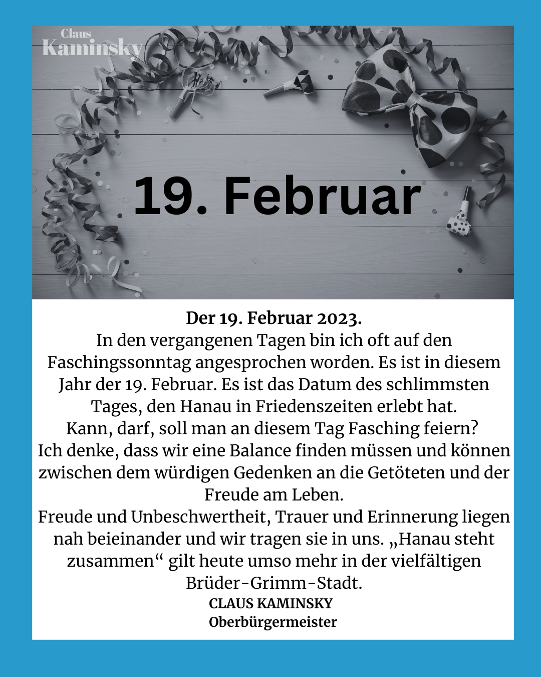 Wir werden den Tag und diese Gräueltaten niemals vergessen. Der 19. Februar wird als Gedenktag uns und die Stadtgesellschaft fortan immer daran erinnern, dass die Hanauerinnen und Hanauer für ein friedliches Miteinander zusammenstehen. Die stadtweite Trauerbeflaggung wird ein unübersehbares Zeichen dafür sein, dass wir in unserem Gedenken an der Seite der Angehörigen stehen.