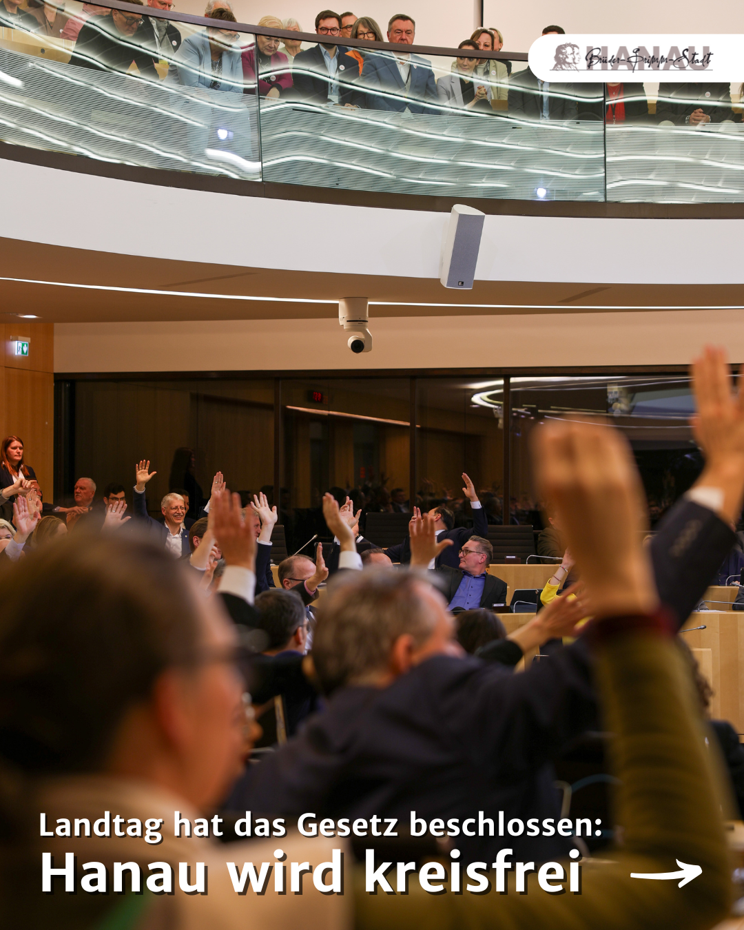 Hanau. Es ist ein historischer Schritt: Der Hessische Landtag hat am Dienstagabend um 19.57 Uhr das Gesetz verabschiedet, das den Austritt der Stadt Hanau aus dem Main-Kinzig-Kreis regelt. Damit ist Hanau ab 1. Januar 2026 eine kreisfreie Stadt. „Die Kreisfreiheit Hanaus ist ein Meilenstein in der Geschichte unserer Stadt“, sagt Oberbürgermeister Claus Kaminsky. ...