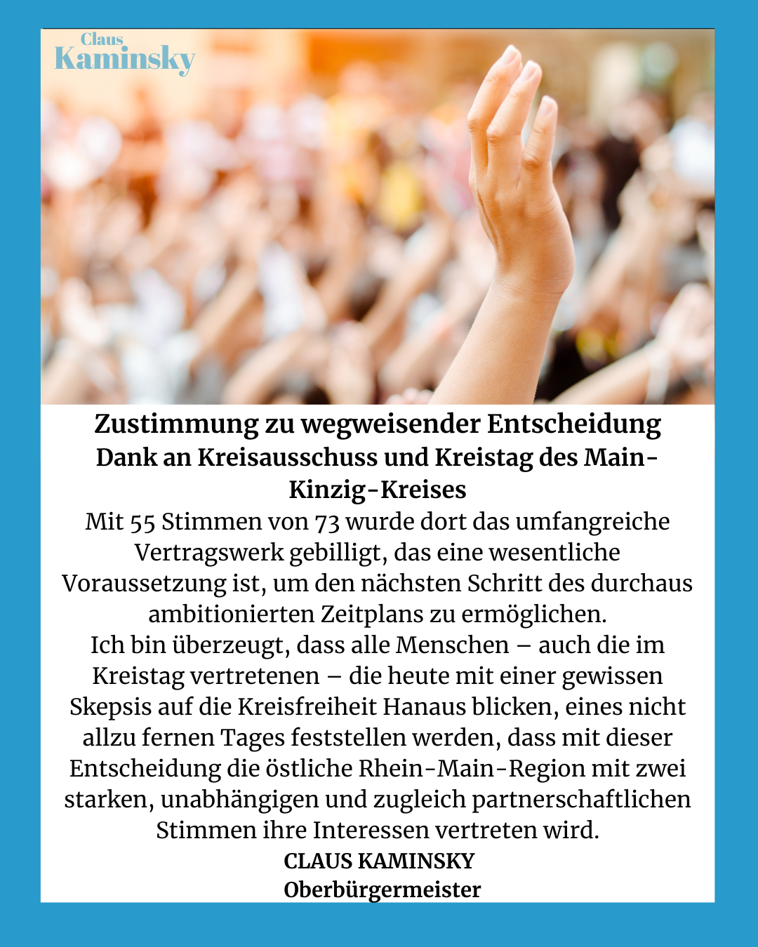 Ich habe im Innenausschuss daran erinnert, dass der partei-, fraktions- und gremienübergreifende Antrag auf Auskreisung im August 2018 einstimmig ohne Gegenstimmen  von der Stadtverordnetenversammlung beschlossen wurde. Noch am gleichen Tag ist dieser Beschluss dem hessischen Ministerpräsidenten Volker Bouffier übersandt worden, mit der Bitte, ein Gesetz zur Auskreisung der Stadt Hanau zu veranlassen. Das daraufhin von der Landesregierung geforderte Konzept zur Kreisfreiheit wurde zeitnah erstellt. Darin hat die Stadt ihre Leistungsfähigkeit nachgewiesen und nachvollziehbar dargestellt, wie sie zusätzliche Aufgaben wahrnehmen wird.