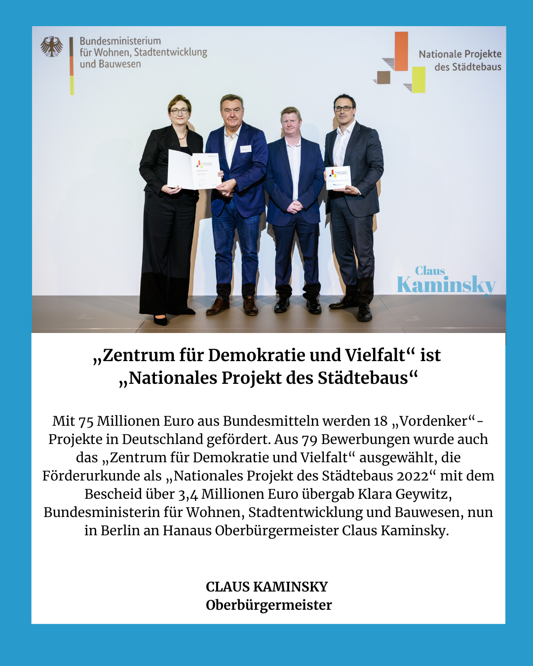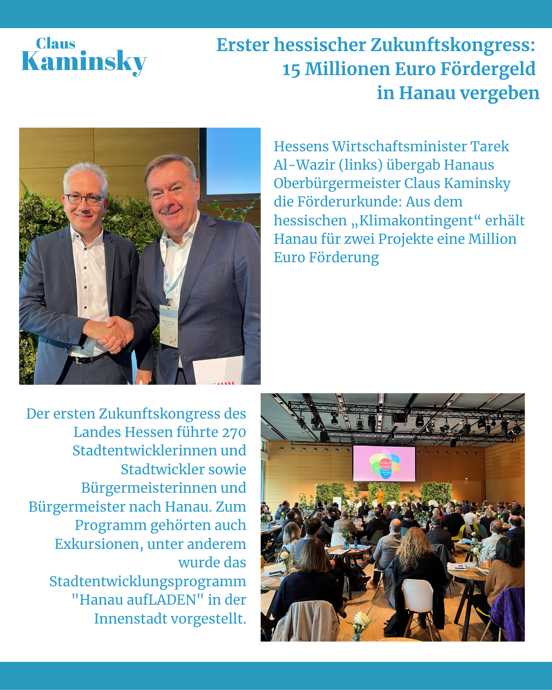 Auf einem Podium der Unternehmensgruppe Nassauische Heimstätte diskutierte Oberbürgermeister Claus Kaminsky unter anderem mit Klara Geywitz (Bundesministerin für Wohnen, Stadtentwicklung und Bauwesen) zum Thema „Zukunftsfähige Innenstadt – neue Ideen für die urbanen Zentren“. Kaminsky stellte klar, dass multifunktionale Ansätze, weg von der reinen Handelsimmobilie, bei der Nachnutzung den größten Erfolg versprechen. „Monofunktionale Innenstädte haben ausgedient. Daher vereinen wir unterschiedlichste Themenfelder wie Bildung, Erlebnis, Kultur und eben auch ein besonderes Einkaufserlebnis im neuen Stadthof. Es entsteht ein Treffpunkt im Herzen der Stadt, wir schaffen ein neues Quartier.“