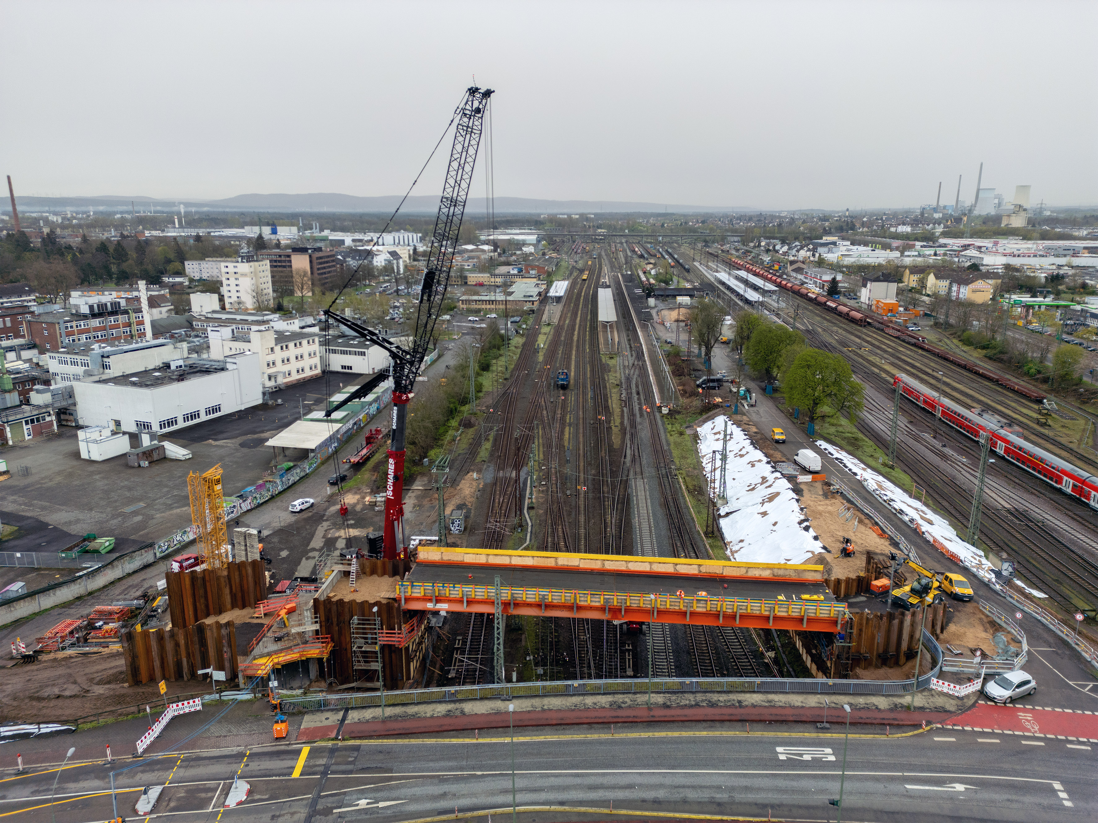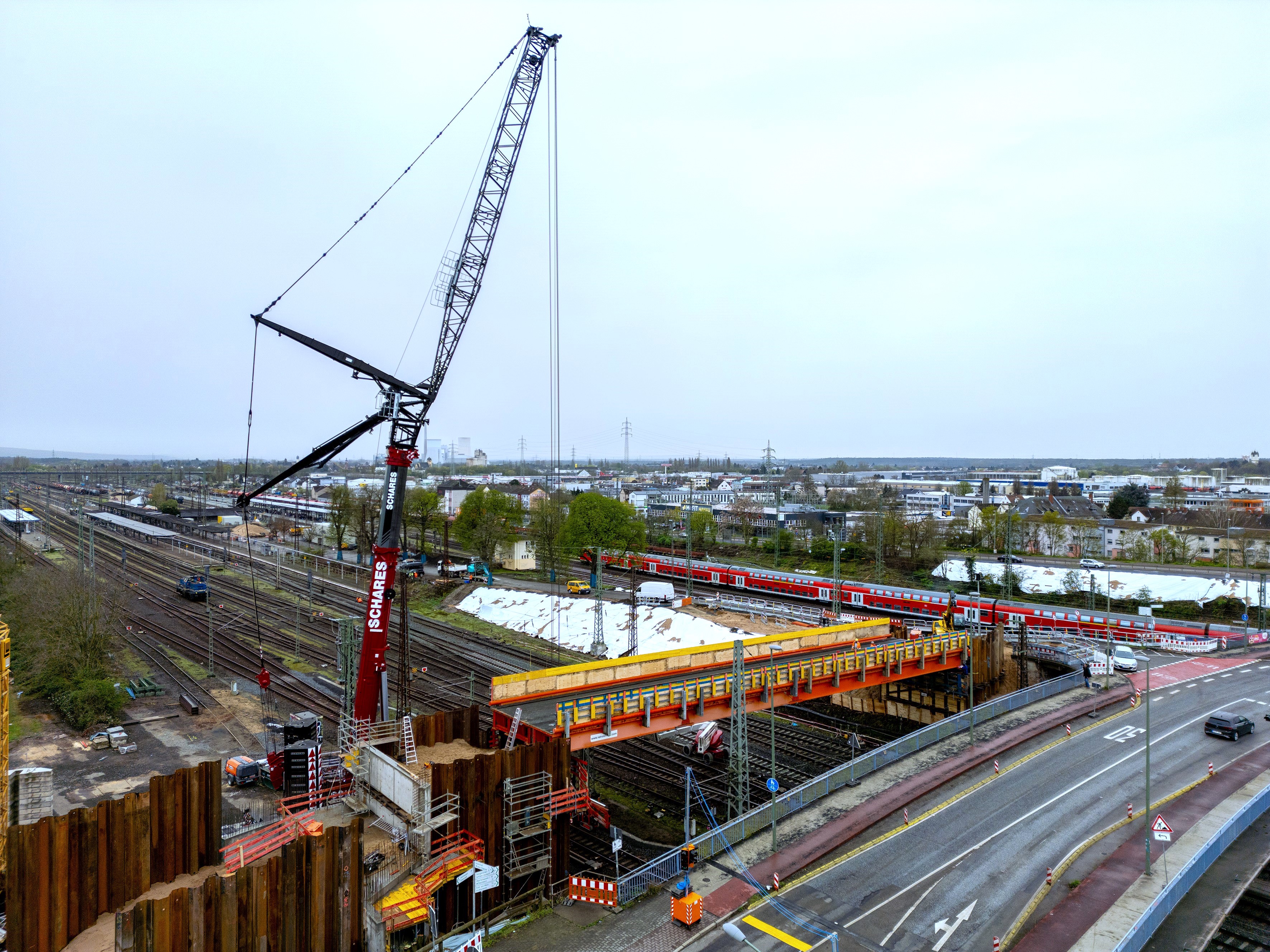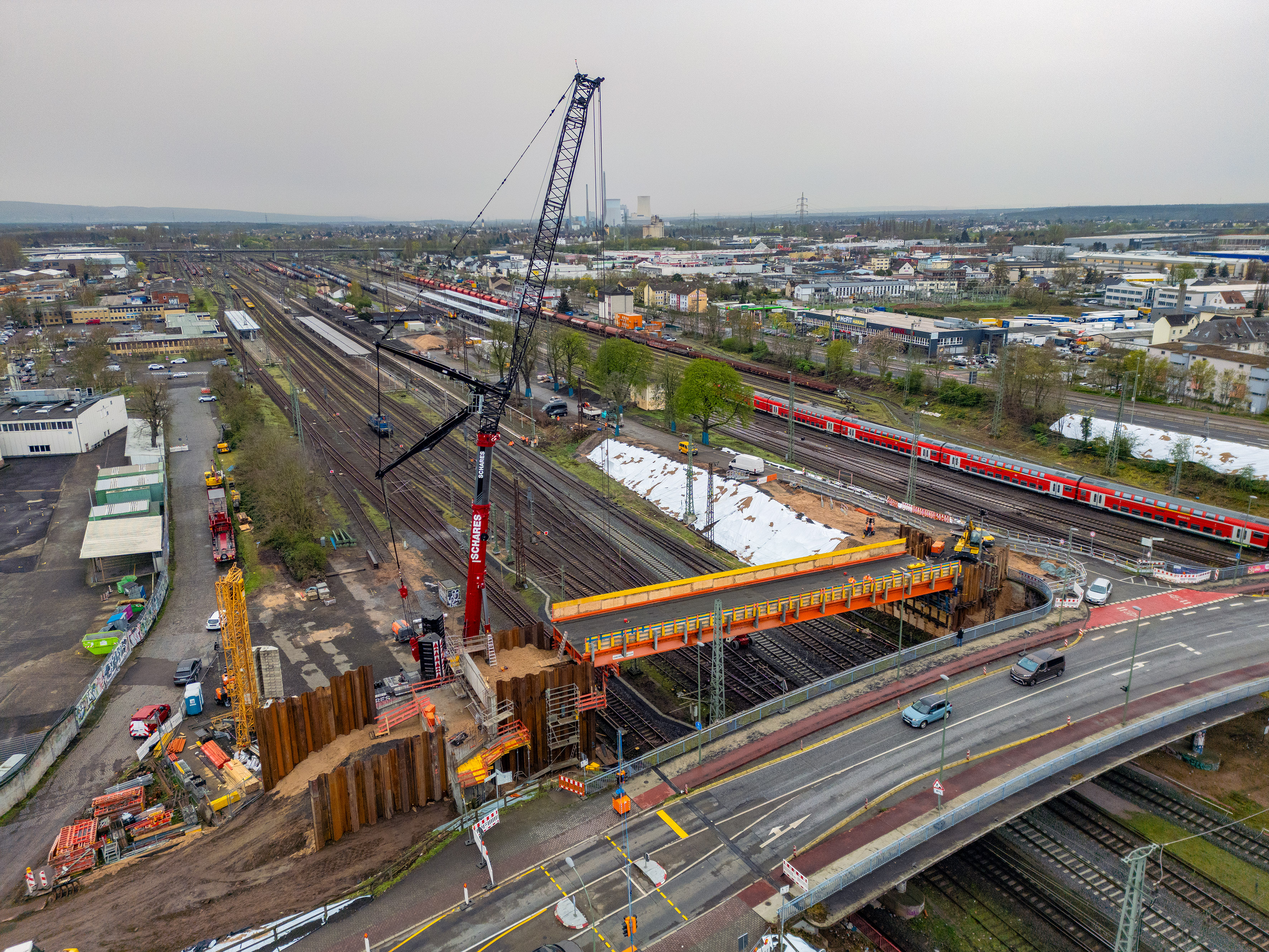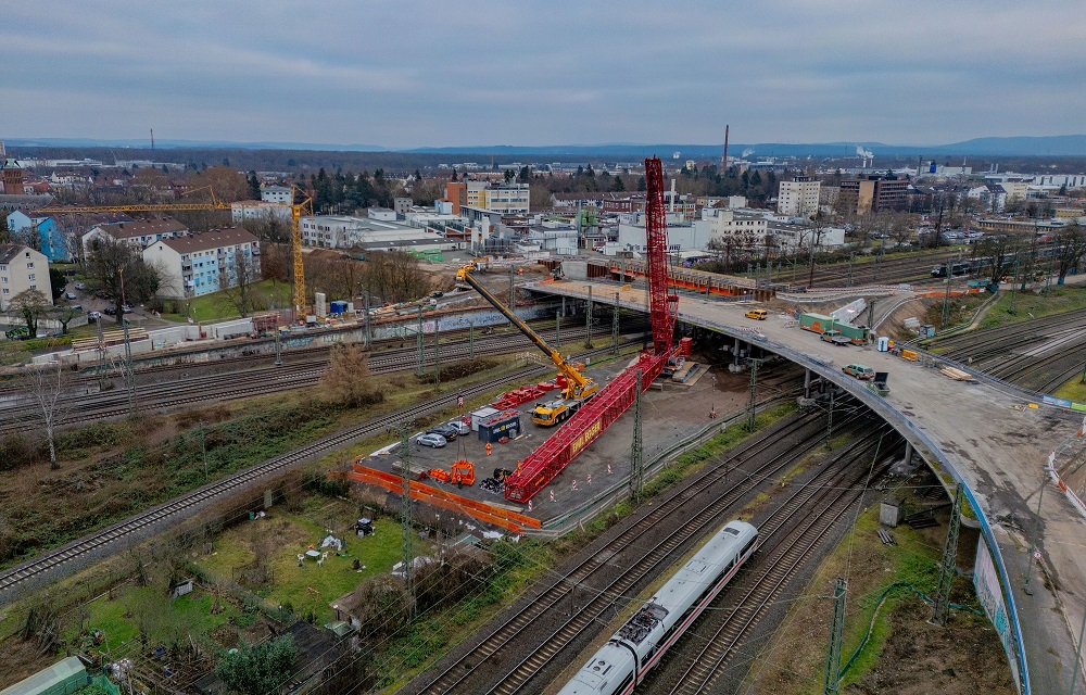 Am Wochenende vom 23. und 24. August wurden die ersten neun Verbundfertigteilträger für den Neubau der Hanauer Hauptbahnhofbrücke erfolgreich eingehoben. Die Träger bilden künftig die Grundlage für die Fahrbahn sowie die Fuß- und Radwege des nördlichen Brückenbauwerkes. Damit ist ein weiterer Meilenstein im größten Infrastrukturprojekt der Stadt seit Jahrzehnten erreicht. Die Arbeiten fanden während einer 32-stündigen Sperrpause des Bahnverkehrs statt. Sämtliche Abläufe, von der Anlieferung der rund 52 Meter langen Fertigteilträger über den anschließenden Einhub mit zwei Mobilkranen bis hin zur endgültigen Positionierung auf den neuen Widerlagerwänden, verliefen planmäßig. Auch beim Bahnverkehr gab es keine unvorhergesehenen Beeinträchtigungen; die Einschränkungen entsprachen genau den zuvor angekündigten Maßnahmen. ...