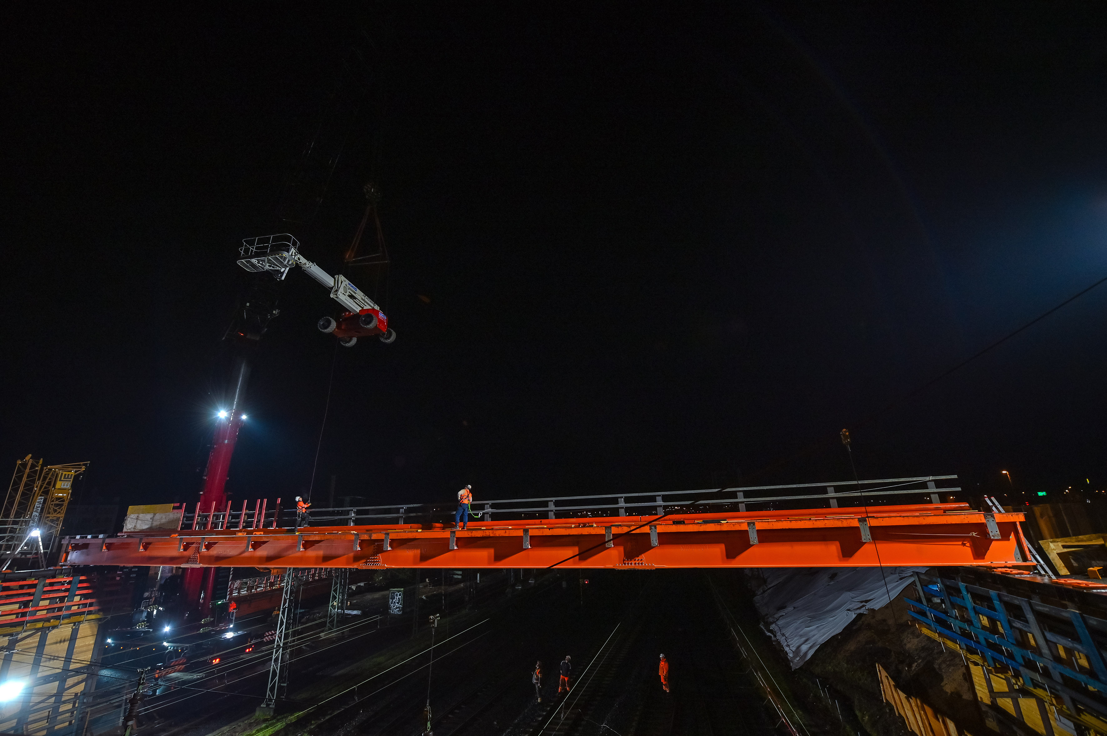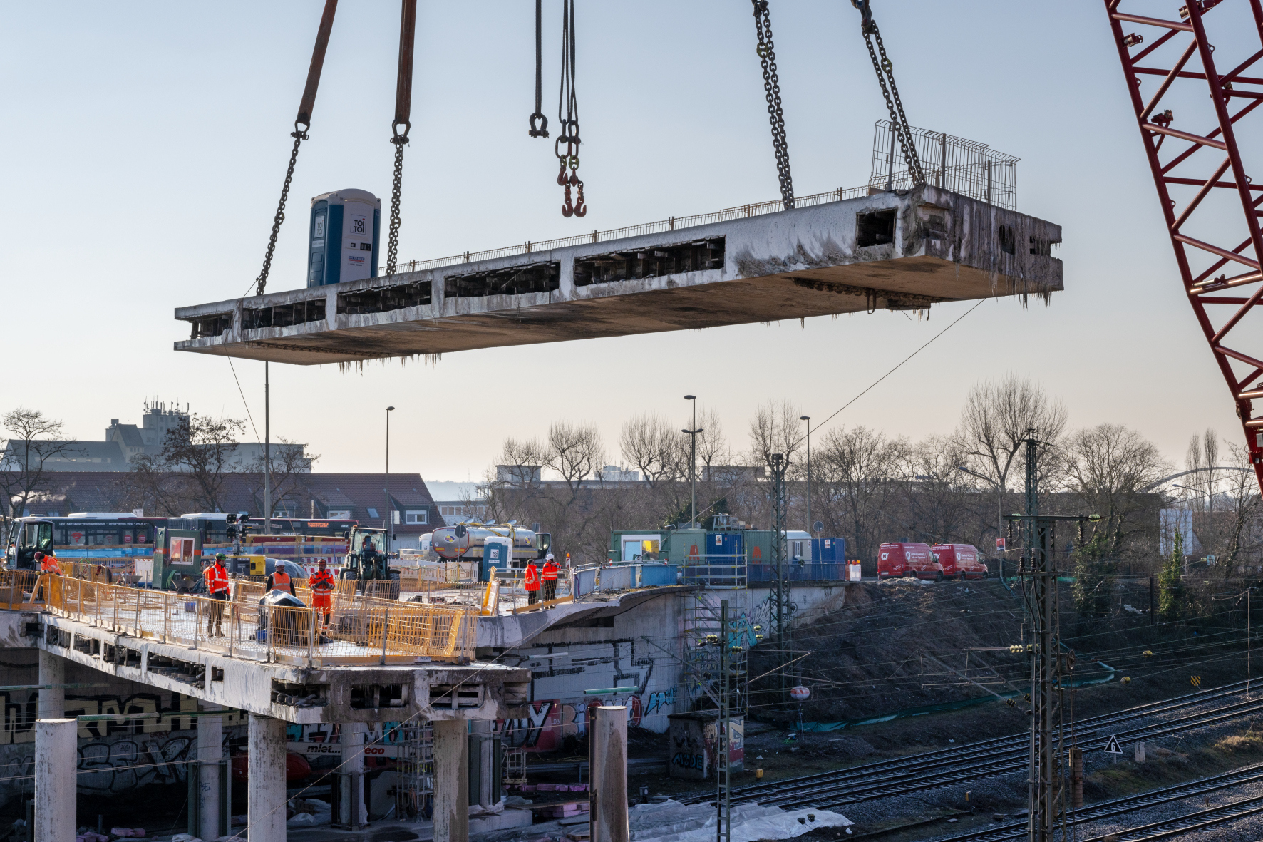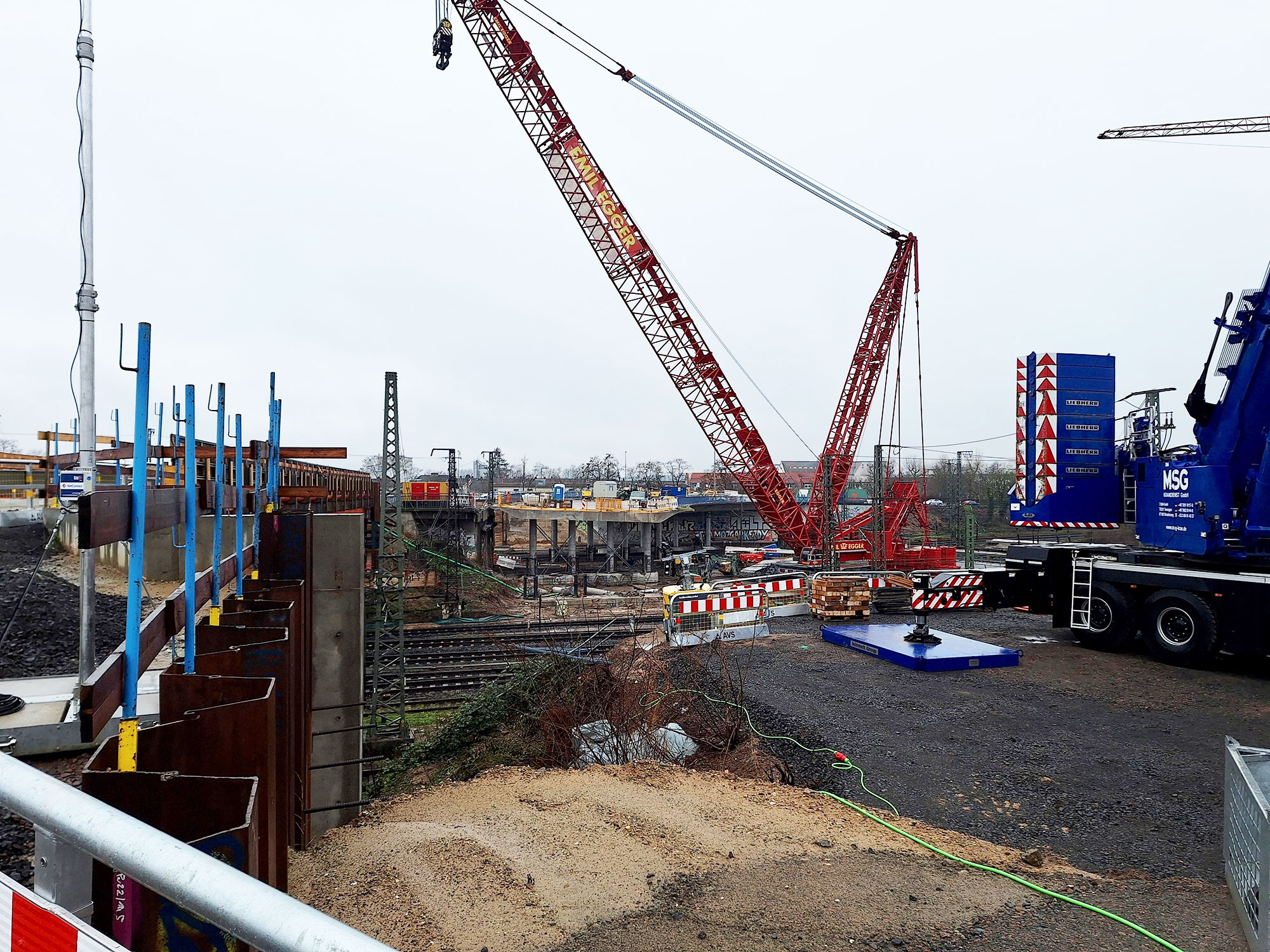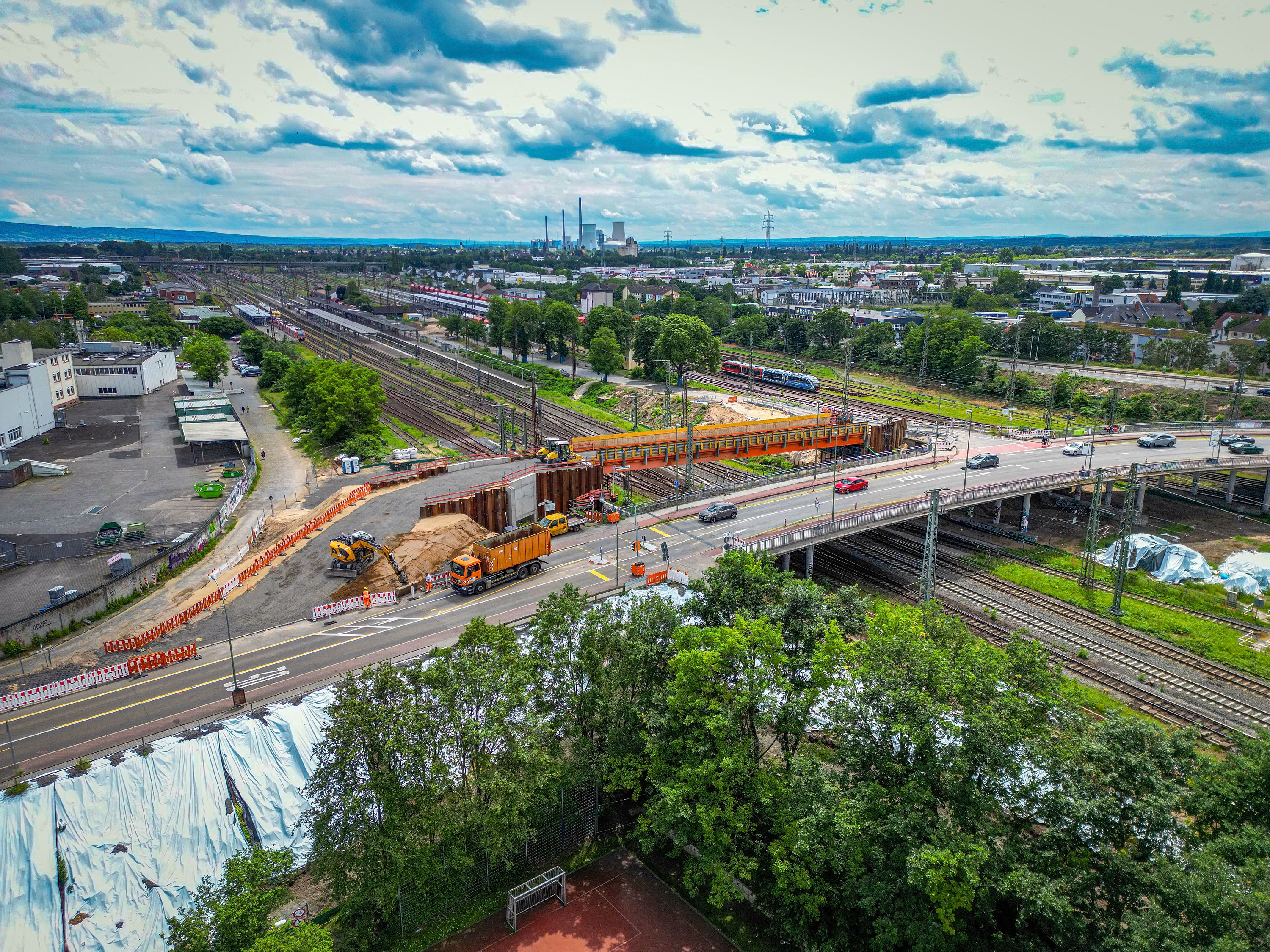 Am Wochenende vom 23. und 24. August wurden die ersten neun Verbundfertigteilträger für den Neubau der Hanauer Hauptbahnhofbrücke erfolgreich eingehoben. Die Träger bilden künftig die Grundlage für die Fahrbahn sowie die Fuß- und Radwege des nördlichen Brückenbauwerkes. Damit ist ein weiterer Meilenstein im größten Infrastrukturprojekt der Stadt seit Jahrzehnten erreicht. Die Arbeiten fanden während einer 32-stündigen Sperrpause des Bahnverkehrs statt. Sämtliche Abläufe, von der Anlieferung der rund 52 Meter langen Fertigteilträger über den anschließenden Einhub mit zwei Mobilkranen bis hin zur endgültigen Positionierung auf den neuen Widerlagerwänden, verliefen planmäßig. Auch beim Bahnverkehr gab es keine unvorhergesehenen Beeinträchtigungen; die Einschränkungen entsprachen genau den zuvor angekündigten Maßnahmen. ...