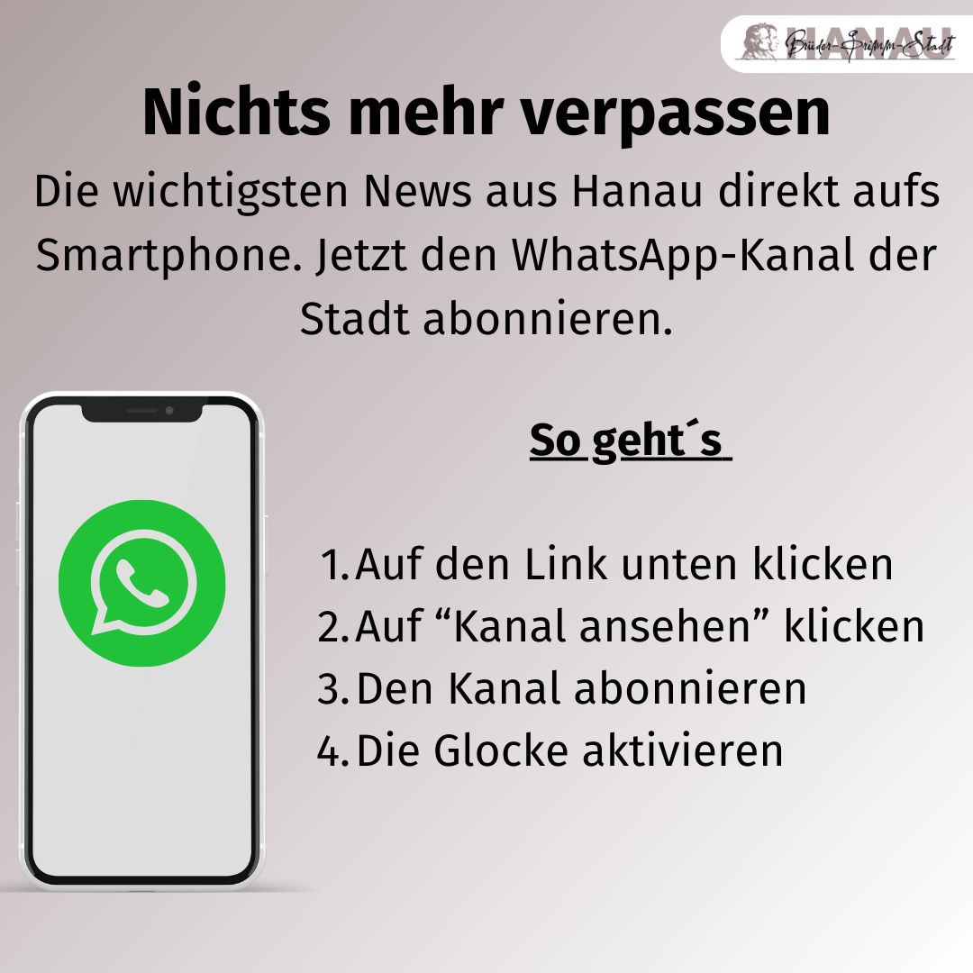 Ab sofort informiert die Stadt Hanau mit einem eigenen WhatsApp-Kanal in dem Messenger-Dienst aktuell und regelmäßig: Hier gibt es die wichtigsten Meldungen, Hinweise auf Veranstaltungen, Notfallwarnungen und mehr aus Hessens kleinster Großstadt.