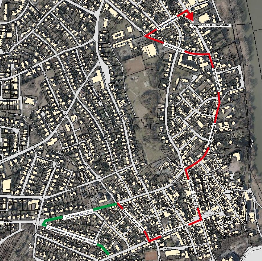 Doorner Straße, Thüringer Straße, Ludwigstraße bis Kulturhalle Steinheim (Auflösung).