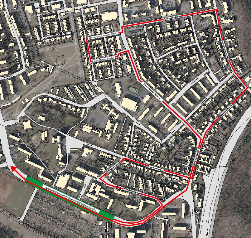 Dr.-Hermann-Krause-Straße, Karl-Mattes-Straße, Chemnitzer Straße, Neuhofstraße, Auflösung des Zuges in der August-Schärttner-Straße.