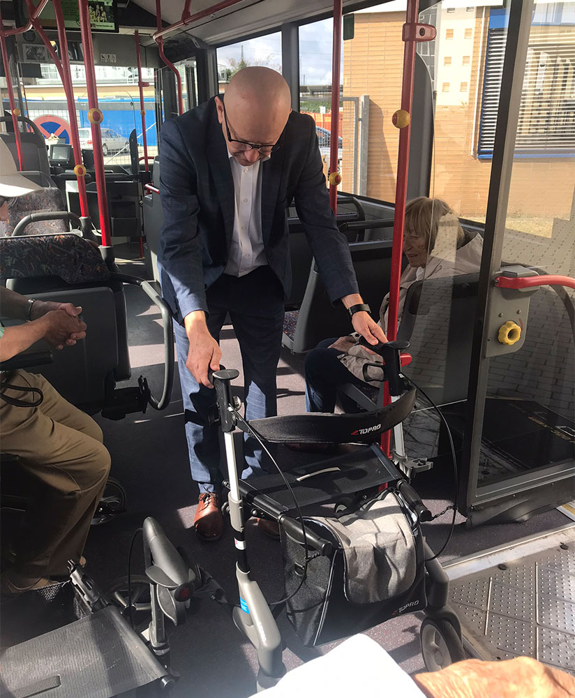 Herr Ruefer von der HSB, der das Rollatorentraining durchführte, hatte zur Veranschaulichung in Praxis und Theorie viele Beispiele aus dem Alltag parat. Allen Teilnehmer*innen (insgesamt 3 Rollator-Nutzerinnen, und 6 Interessierte, davon 5 Teilnehmer*innen vom Seniorenbeirat der Stadt Hanau) wurde klar, dass die Nutzung eines Rollators im Bus eine logistische Aufgabe ist.