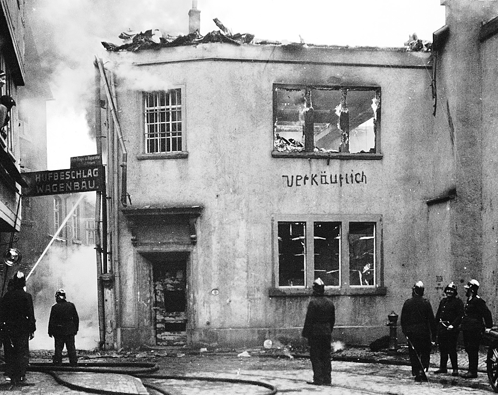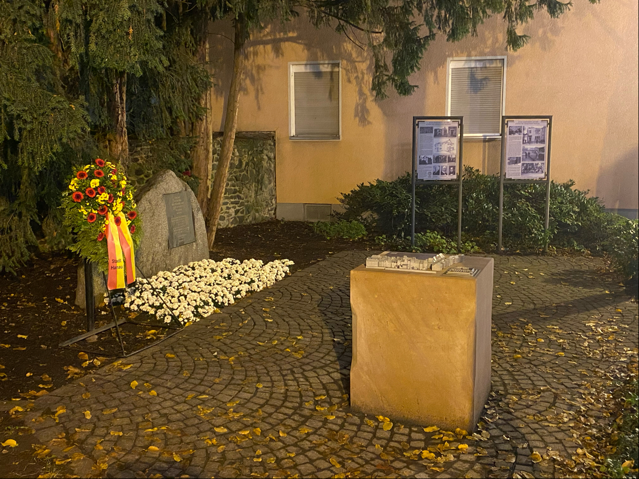 Die Gedenkstätte an die Reichspogromnacht 1938 und die ehemalige Hanauer Judengasse (seit 1898 Nordstraße) befindet sich gegenüber dem Standort der ehemaligen Synagoge. Das Gebäude wurde am 10. November 1938 von NS-Schergen in Brand gesteckt und zerstört.