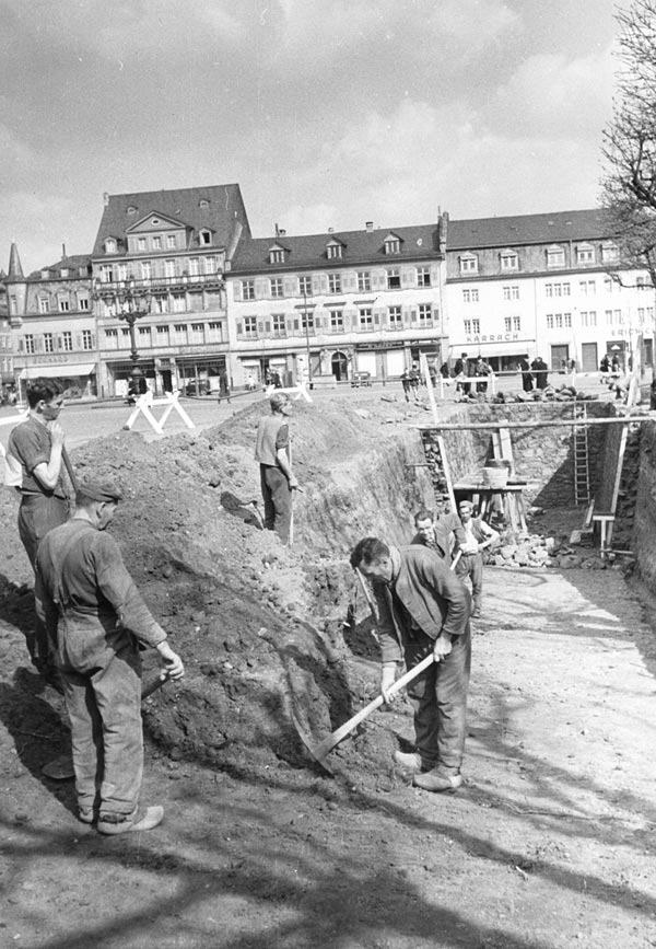 Kriegsgefangene beim Bau des Löschwasserbeckens auf dem Marktplatz, April 1943