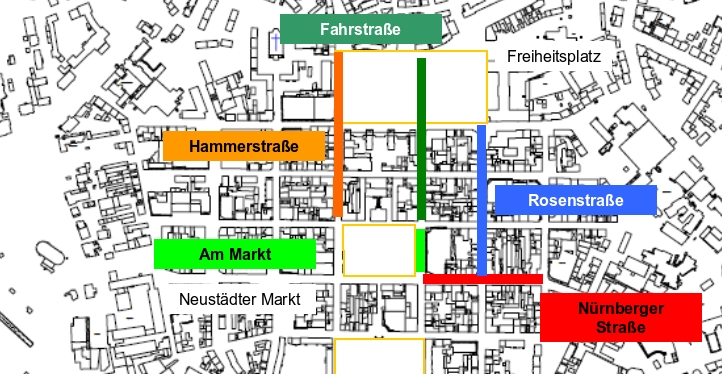 Maßnahmen unumgänglich waren: Die Hammerstraße, die Nürnberger Straße, die Rosenstraße, Am Freiheitsplatz und die Fahrstraße.Neben den Erschließungsarbeiten diente die gestalterische Aufwertung der Straßenzüge