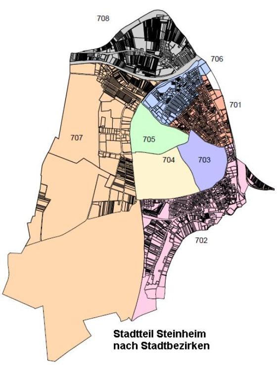 Hanau´s südwestlichster Stadtteil entwickelte sich aus einem nördlichen fränkischen Besiedlungskern bei der St.-Nikolaus-Kirche (ehem. Klein-Steinheim) und einem südlichen auf dem Basaltplateau mit der Burg der Herren von Eppstein (ehem. Groß-Steinheim). Bereits Jäger und Sammler kamen vor über 12.000 Jahren (Altsteinzeit) nach Steinheim, da der Main Möglichkeiten für den Fischfang hatte, aber auch zum Erlegen tränkender Tiere, bot. Siedlungen gibt es seit der Jungsteinzeit, damals vor 7.500 Jahren wurden die Menschen seßhaft. Die Burg, deren Bau um 1200 begonnen wurde, war für die Herren von Eppstein das Machtzentrum. 1320 erhielten sie die Stadtrechte für Steinheim von König Ludwig IV.
