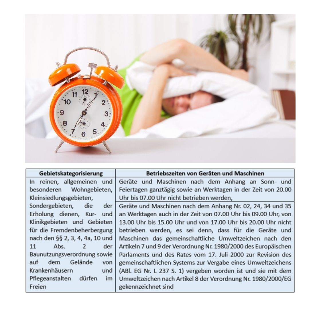 Bestimmte Maschinen und Geräte dürfen in Wohngebieten an Sonn- und Feiertagen sowie nachts grundsätzlich nicht betrieben werden.